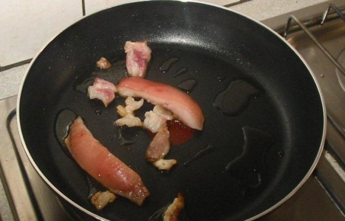 1Отрезаем бараний жир и выкладываем его на раскаленную сковороду. Растапливаем жир в течение 7 минут.