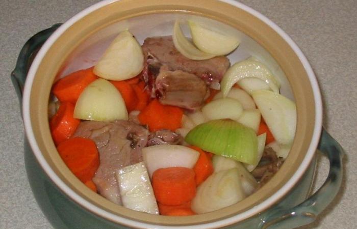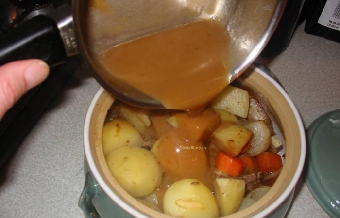 4Баранину выкладываем в кастрюлю вместе с луком и морковью. Добавляем также бульон, вустерский соус и перловую кашу. Сверху выкладываем картофель, солим по вкусу и отправляем в духовку на час, предварительно разогретую до 180 градусов.