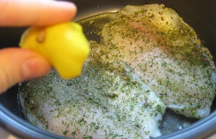 2В чашу мультиварки наливаем масло и включаем режим "Выпечка". Рыбу со всех сторон натираем солью с перцем и выкладываем в чашу мультиварки. Поливаем лимонным соком.