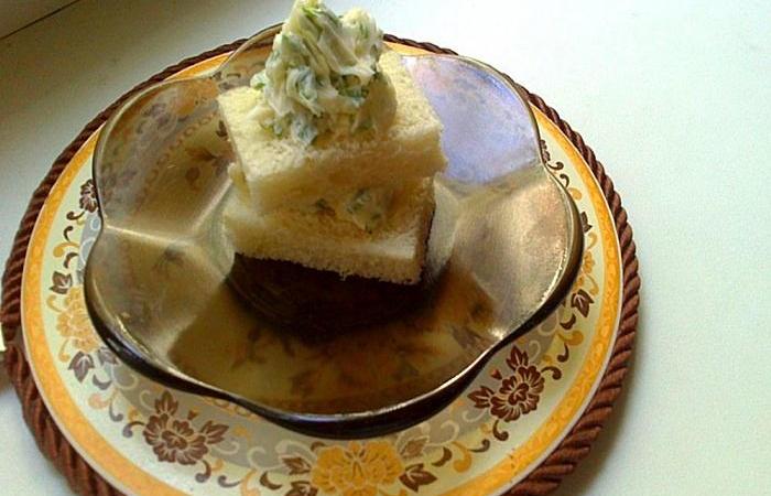 3Ломтики батона режем небольшими квадратиками, предварительно убрав корочку, и намазываем массу.