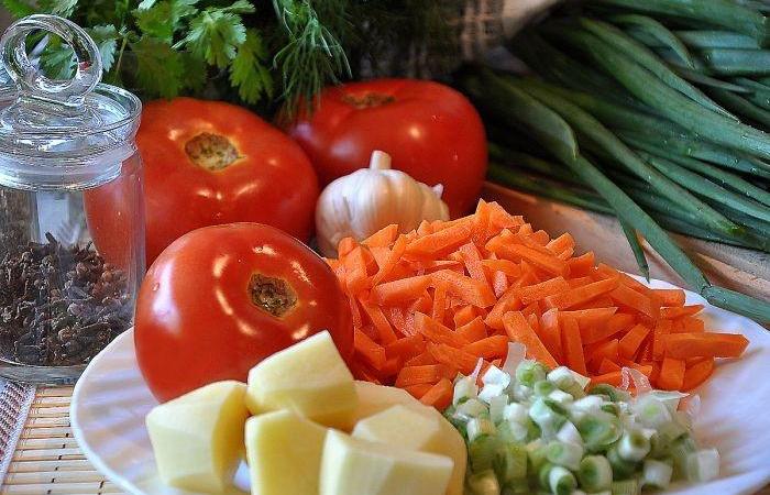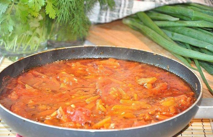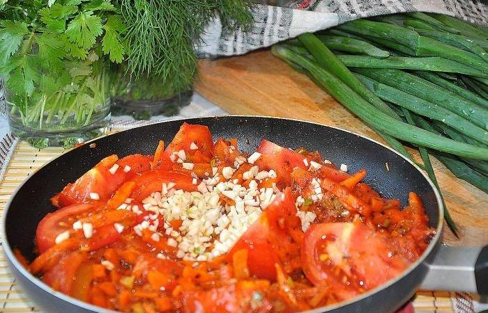 3Разогреваем сковороду, наливаем масло и выкладываем морковь с луком. Также выкладываем нарезанные дольками помидоры и томатный соус с аджикой. Тушим в течение 5 минут, а затем добавляем мелко нарезанный чеснок. Солим, перчим по вкусу.