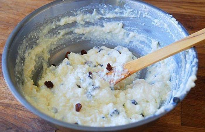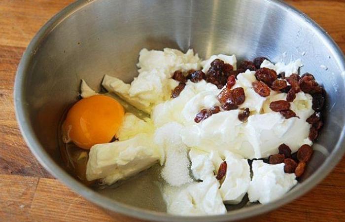 2В миске взбиваем яйца с сахаром и щепоткой соли. Добавляем творог и изюм.