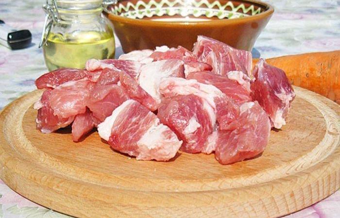 4Тем временем свинину нарезаем крупными кусками.