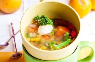 7Добавляем овощи с пшеном в котелок, заливаем водой и продолжаем варить до готовности картофеля и пшена (20-25 минут). Солим, перчим по вкусу.