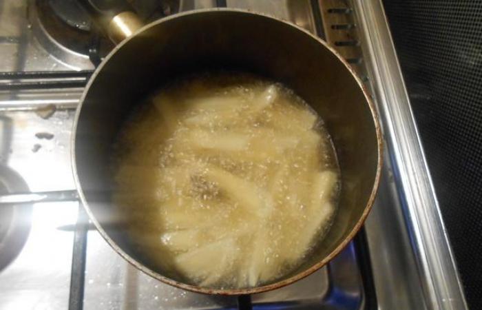 4Разогреваем глубокую кастрюльку, наливаем масло и выкладываем картофель. Обжариваем в течение 10 минут, периодически ворочая ломтики со всех сторон.