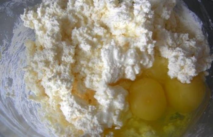 1Творог растираем с яйцами, мукой и солью.