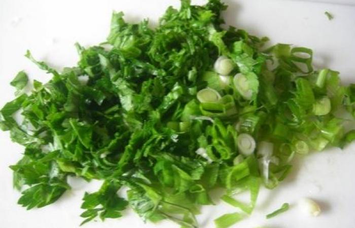 3Зеленый лук режем колечками, а петрушку измельчаем. Добавляем в творожную массу.