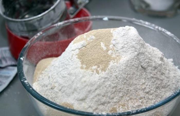 1В миске смешиваем два вида муки с солью, сахаром и дрожжами.