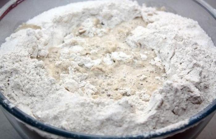 2Делаем углубление в сухой смеси и вливаем теплую воду.