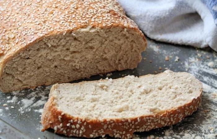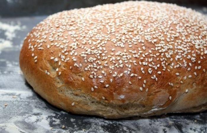 5Выкладываем тесто на посыпанный мукой противень и формируем хлеб. Посыпаем кунжутом и отправляем в духовку на 40 минут, предварительно разогретую до 180 градусов.