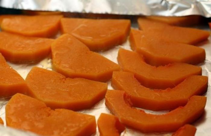 1Тыкву очищаем от кожуры и семечек и режем небольшими кусочками толщиной примерно 1 см и выкладываем на противень, застеленный фольгой. Сбрызгиваем растительным маслом и отправляем в духовку на 25 минут, предварительно разогретую до 190 градусов, чтобы тыква стала мягкой.