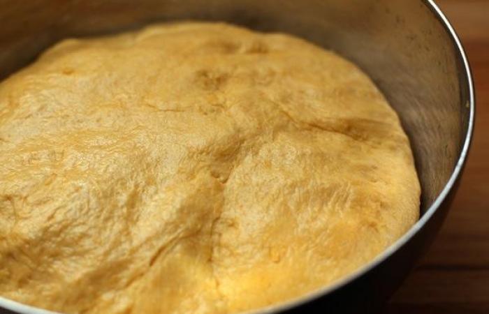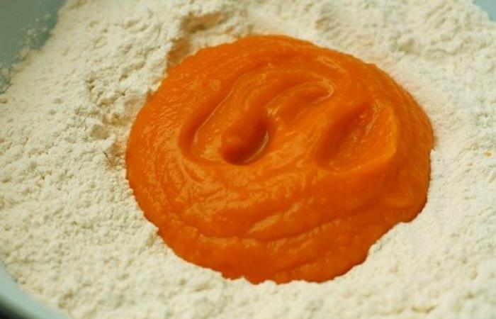 4В миске перемешиваем муку, соль и дрожжи. Делаем в сухой смеси углубление и добавляем тыквенное пюре.