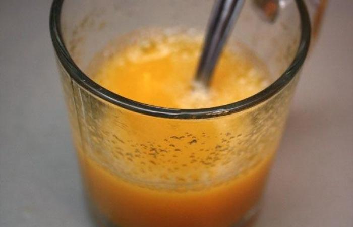 2Выкладываем курагу в чашу блендера, добавляем полстакана апельсинового сока и измельчаем до однородной консистенции пюре.