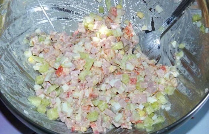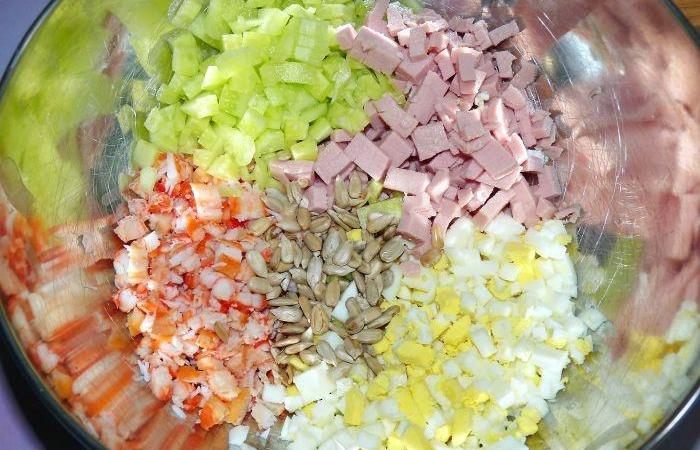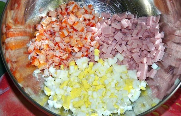 2Ветчину, крабовые палочки и яйца режем мелкими кубиками и выкладываем в глубокую емкость.