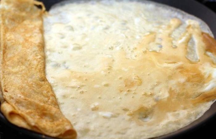 5Готовый блин кладем на край сковороды, а в саму сковороду наливаем еще одну часть теста. Новый блин должен прикрепится к старому.