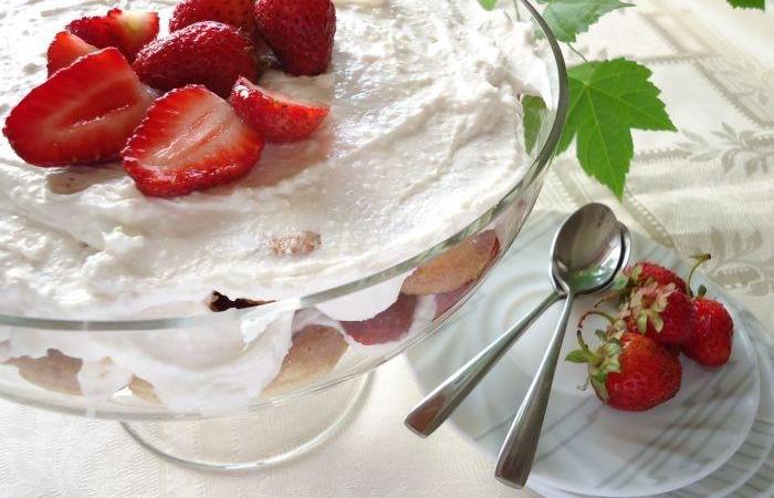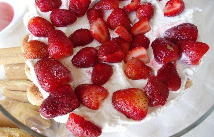 3Часть печенья обмакиваем в вишневую смесь и выкладываем в форму. Затем выкладываем часть творожного крема и порезанную кусочками клубнику. На клубнику выкладываем вторую часть печень, смоченного в вишневой смеси и оставшийся творожный крем. Ставим десерт в холодильник на 4 часа.