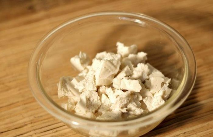 2Тофу режем мелкими кубиками и кладем в отдельную миску.