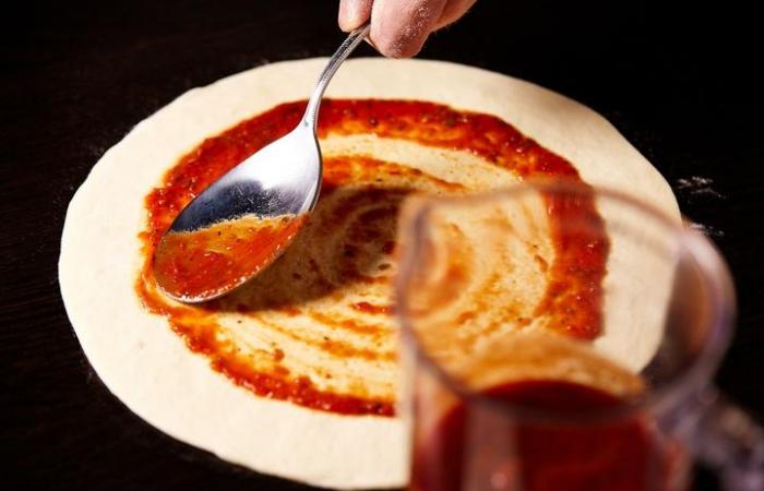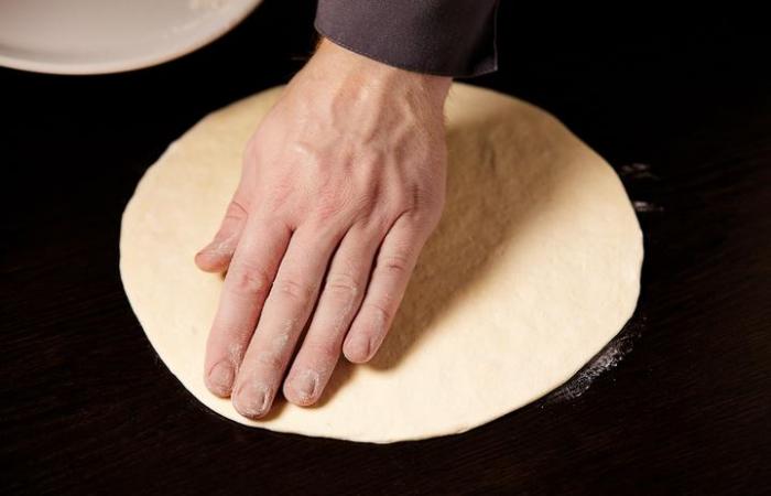 1Приготавливаем необходимые для пиццы ингредиенты. Дрожжи растворяем в теплой воде и оставляем на 20 минут. Затем добавляем муку, соль и оливковое масло. Замешиваем тесто, скатываем его в шар и оставляем в покое на 40-45 минут.