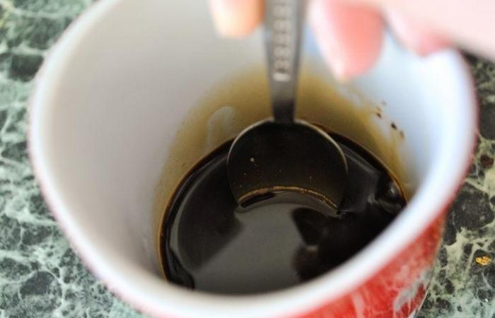 4Наливаем немного воды и размешиваем, чтобы кофе с сахаром растворились.
