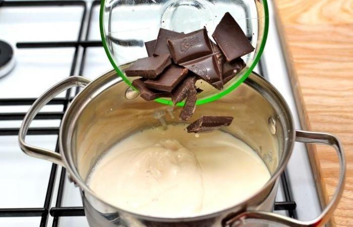 2Кипятим молоком на медленном огне и добавляем кусочки шоколада. Перемешиваем все тщательно с помощью венчика.
