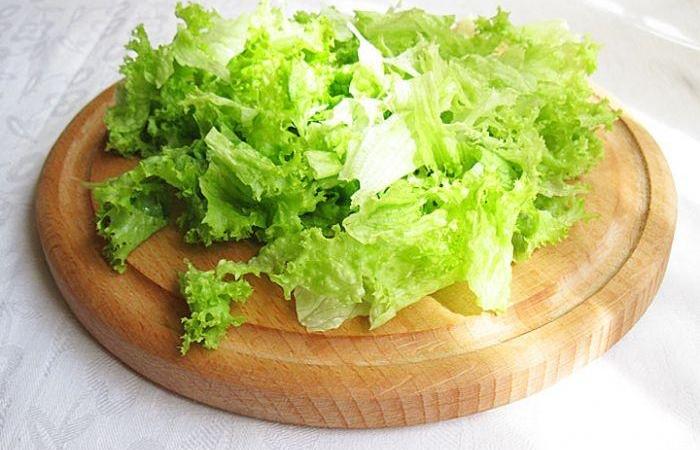 2Листья салата тщательно промываем, обсушиваем и режем произвольными небольшими кусочками.