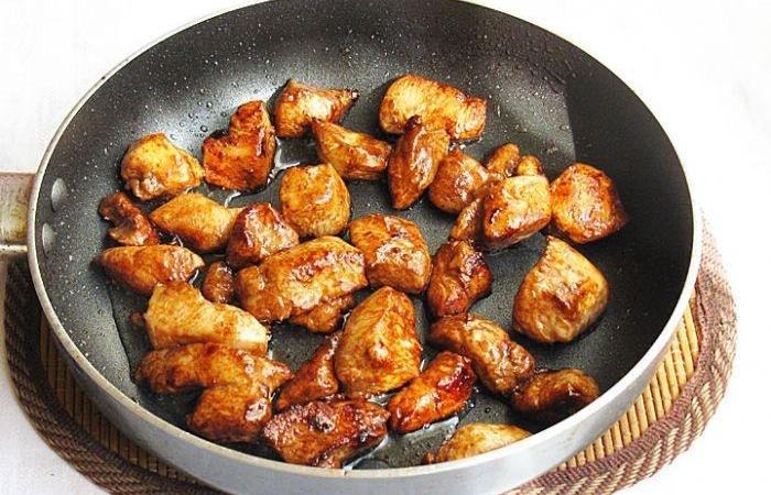 3Куриное филе режем кубиками и обжариваем на сковороде на сильном огне 4 минуты, постоянно переворачивая кусочки. Затем добавляем соевый соус, уменьшаем огонь и жарим еще 3 минуты.