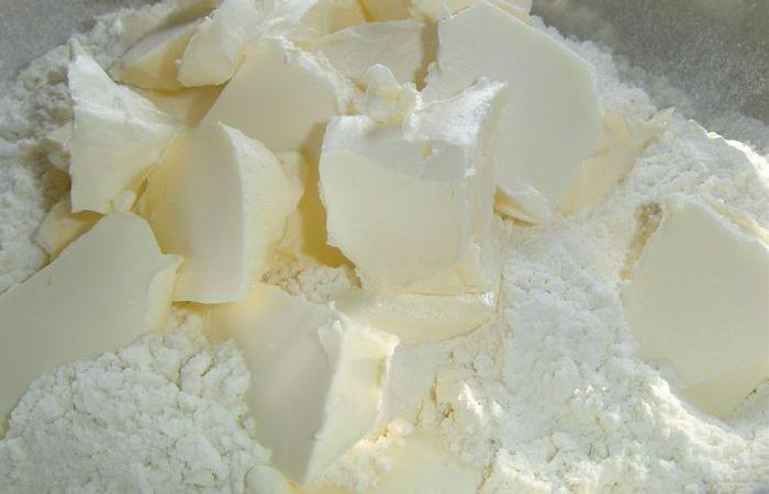 1Муку высыпаем в глубокую емкость и добавляем порезанное кусочками сливочное масло.
