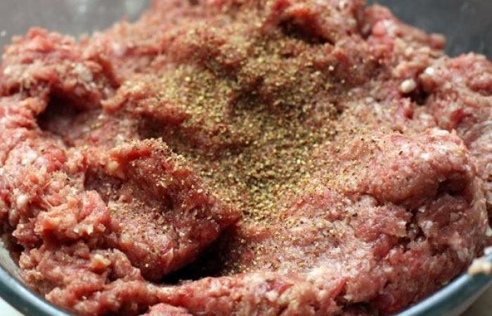 6Вымешиваем тщательно фарш. Солим, перчим и добавляем говяжий бульон.