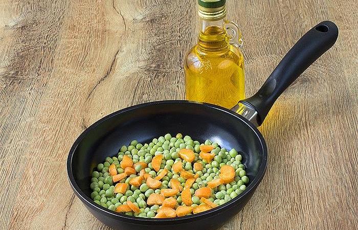2Нагреваем сковороду, добавляем масло и выкладываем горошек, измельченный лук и порезанную кусочками морковь. Добавляем немного воды, солим по вкусу и тушим под закрытой крышкой около получаса на медленном огне.