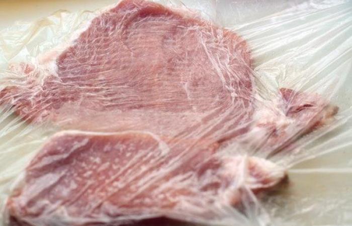 1Свинину режем порционными кусочками толщиной примерно 2 см, а затем обиваем под пищевой пленкой с двух сторон.
