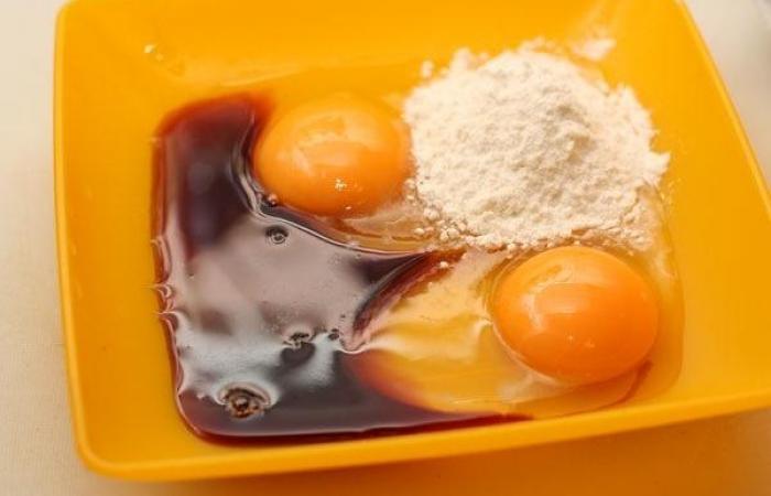 2В миске взбиваем яйца с соевым соусом и мукой.