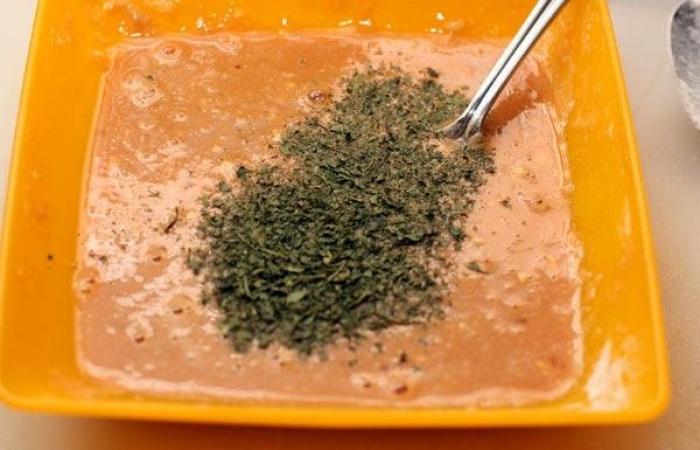 3Добавляем измельченный чеснок и сушеную петрушку. Тщательно перемешиваем кляр.