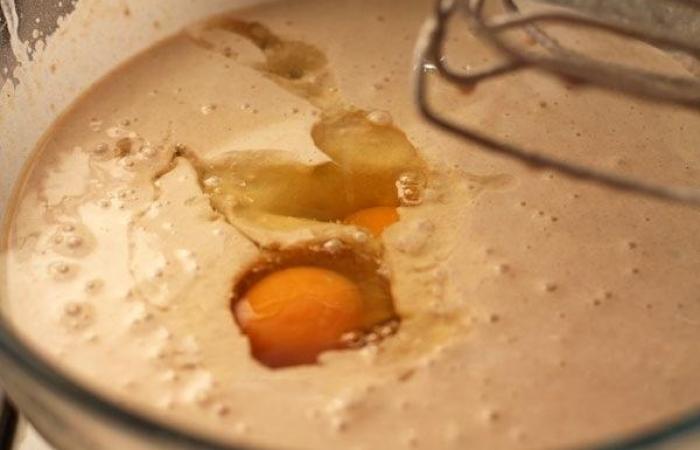 3Добавляем яйца, сахар и соль. Взбиваем все с помощью венчика или миксера, чтобы не было комочков.