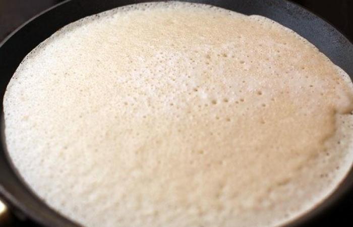 5Выливаем часть теста на раскаленную сковороду и жарим в течение нескольких минут до готовности с одной стороны.