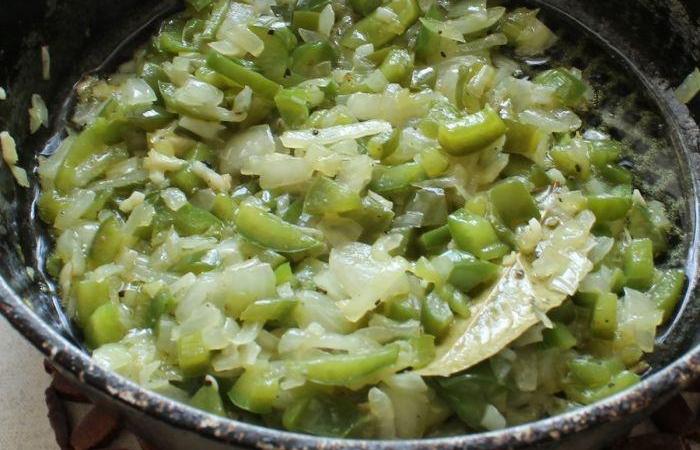 2Лук с чесноком измельчаем и обжариваем на сковороде около 5 минут, периодически помешивая. Затем добавляем порезанный небольшими кусочками перец и лавровый лист. Солим, перчим и продолжаем обжаривать еще около 8-10 мину.