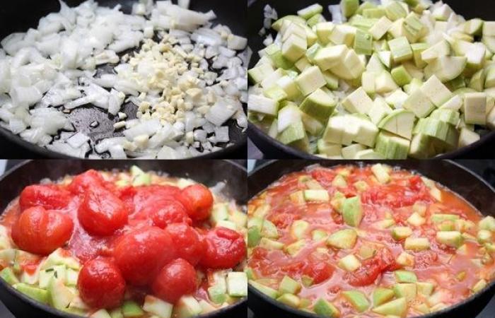 3Тем временем готовим начинку. Лук с чесноком измельчаем и обжариваем на масле в течение 4-5 минут. Затем добавляем нарезанные кубиками кабачки и помидоры в собственном соку. Тщательно все перемешиваем.