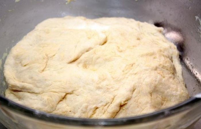 2Накрываем миску с пиццей пищевой пленкой и оставляем в теплом месте на 50 минут. По истечению времени обминаем тесто и снова оставляем на 30 минут.