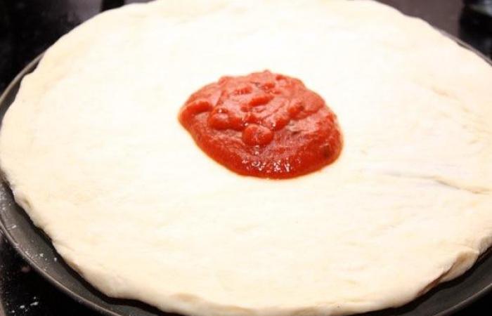 3Раскатываем тесто в тонкий пласт и выкладываем томатную пасту.
