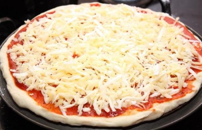 4Распределяем соус равномерно по всей поверхности теста и посыпаем тертым сыром.