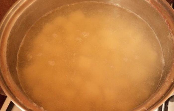 1Картофель режем кубиками, заливаем водой и отвариваем до готовности около 20 минут. По истечению времени достаем картофель из воды, а саму воду не сливаем.