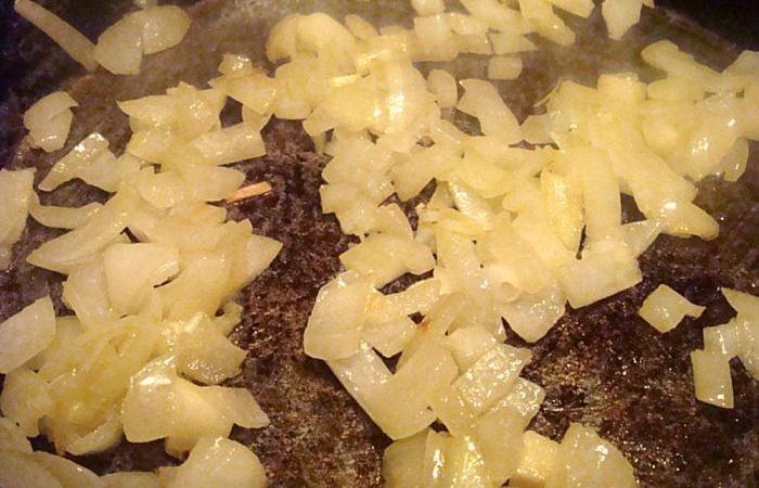 2Лук режем мелкими кубиками и обжариваем на сливочном масле до прозрачности около 5-7 минут, периодически помешивая.