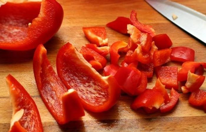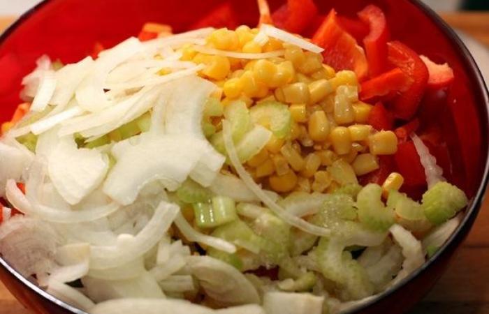 5Выкладываем перец в салатницу и добавляем кукурузу.