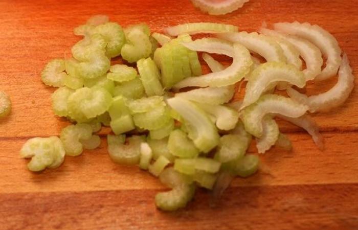 7Выкладываем сельдерей в салатницу и добавляем фасоль и нарезанный четверть кольцами лук.
