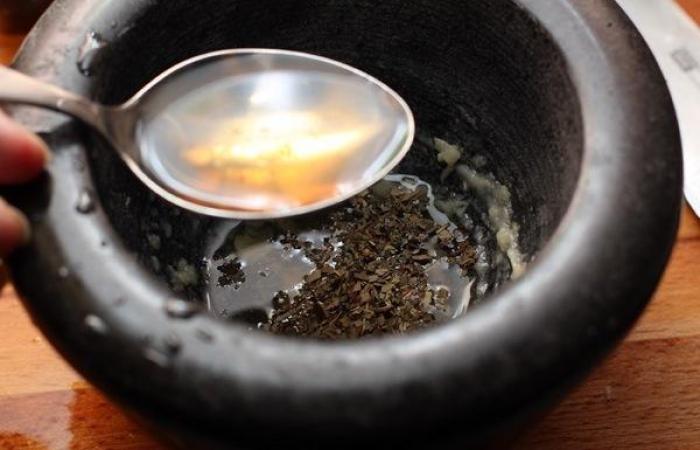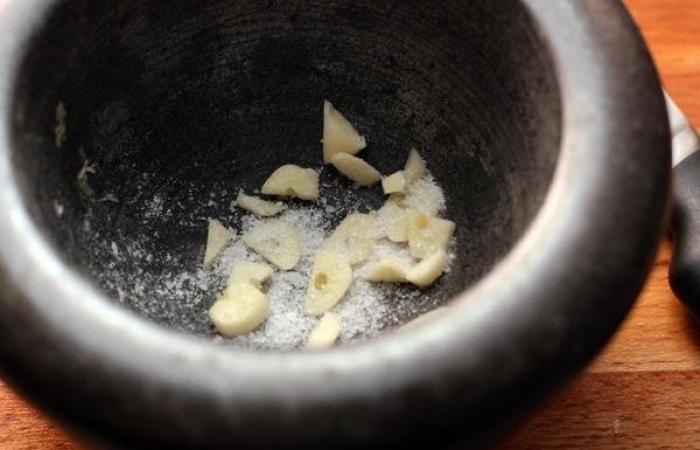 8Готовим заправку. Растираем в ступке пластины чеснока с солью.