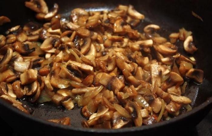 1Лук с шампиньонами нарезаем небольшими кусочками и обжариваем на масле в течение 5-7 минут, периодически помешивая.