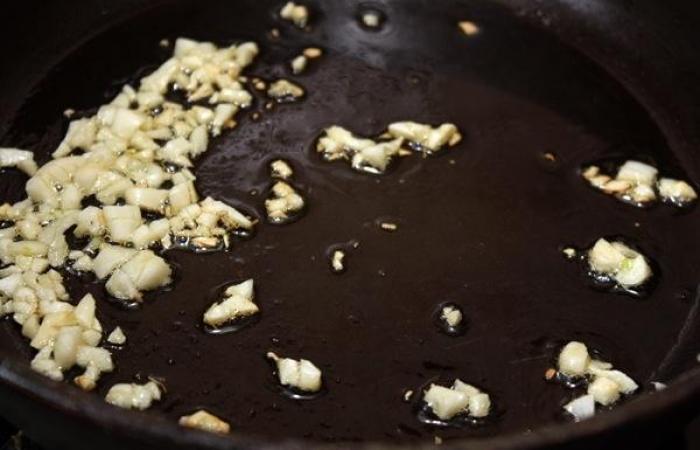 1Чеснок режем мелкими кубиками и обжариваем на масле в течение нескольких минут. Затем добавляем томатное пюре и готовим в течение 7-8 минут, периодически помешивая.
