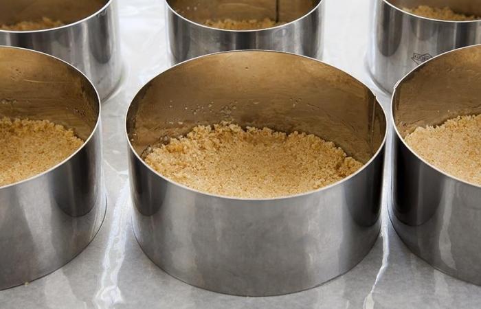 2Печенье измельчаем до состояния крошки и смешиваем с размягченным сливочным маслом. Сервировочные кольца смазываем сливочным маслом с внутренней стороны и выкладываем на противень, застеленный пергаментом. В каждое кольца кладем по 3 столовые ложки получившегося теста и утрамбовываем с помощью ложки.
