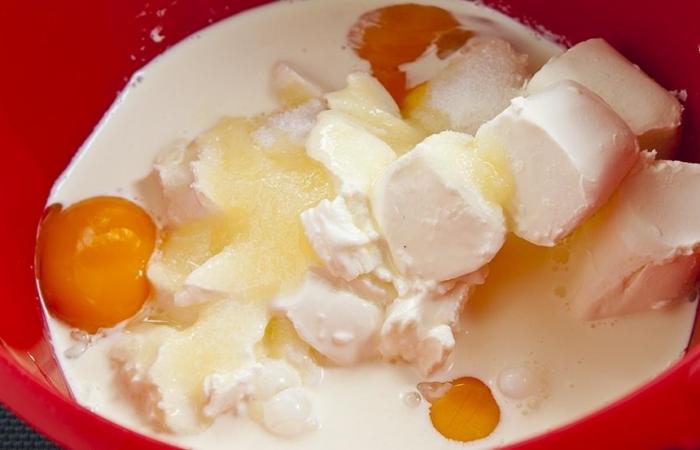 3В отдельную емкость выливаем сливки и добавляем отделенные от белков желтки, сахар, сливочный сыр, творог и сыр "Филадельфия".