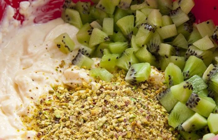 4Перемешиваем массу и добавляем порезанные кусочками киви и измельченные фисташки (немного оставляем для украшения).