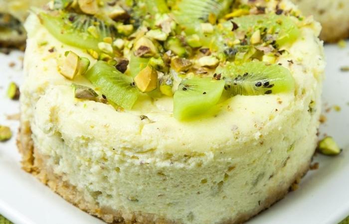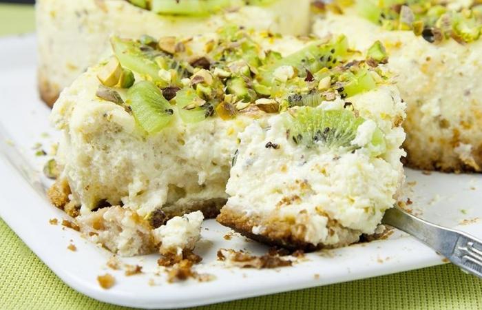7Порционный чизкейк достаем из духовки, снимаем кольцо и украшаем киви с фисташками. Подаем к столу, приятного аппетита!